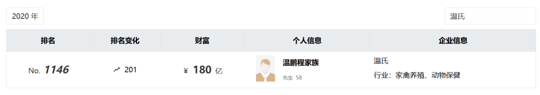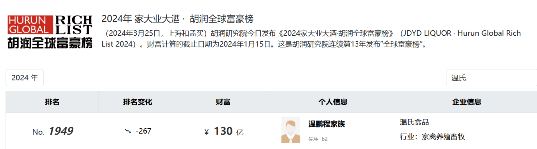背后的温氏家族财富也明显缩水。《胡润全球富豪榜》显示,2020年时,温鹏程家族财富达到180亿元,到2024年时剩余130亿元,4年缩水50亿元。