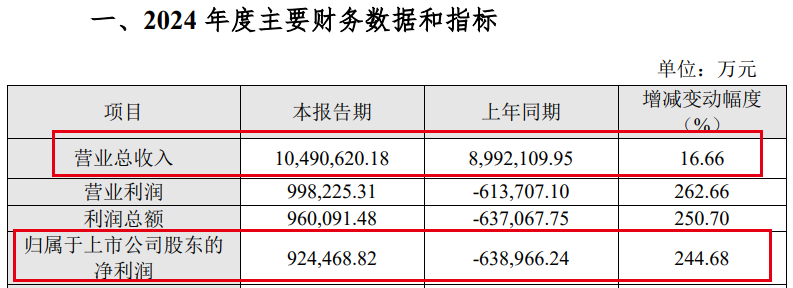 数据显示,2024年,公司实现营收1049亿元,同比增长16.66%;归母净利润92亿元,同比增长244.68%。