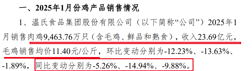 其披露的数据显示,新年伊始,肉鸡销量、价格已经全面下滑。1月,公司销售肉鸡9463.76万只(含毛鸡、鲜品和熟食),收入23.69亿元,毛鸡销售均价11.40元/公斤,分别同比下滑5.26%、14.94%、9.88%。