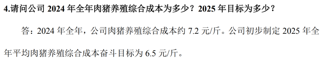 温氏股份也有意继续压缩养殖成本。2月14日,其管理层表示,2024年肉猪养殖综合成本约7.2元/斤,初步制定2025年平均肉猪养殖综合成本奋斗目标为6.5元/斤。