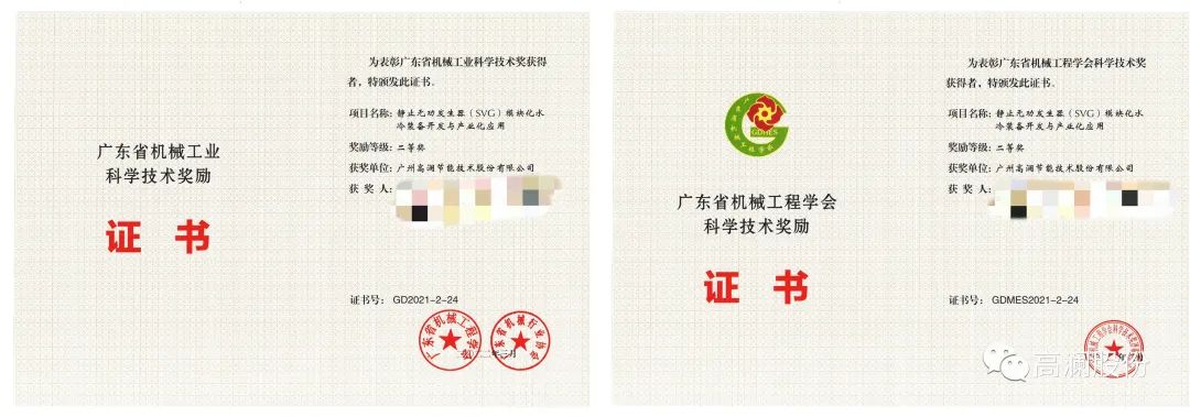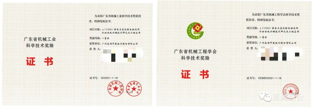 近日,高澜股份“±1100kV特高压直流输电换流阀冷却系统关键技术研究及工程应用”,及“静止无功发生器(SVG)模块化水冷装备开发与产业化应用”两个项目经广东省机械工程学会科学技术奖评审委员会和广东省机械工业科学技术奖评审委员会评审,分别授予2021年度广东省机械工业科学技术一等奖和二等奖、广东省机械工程学会科学技术奖一等奖和二等奖。