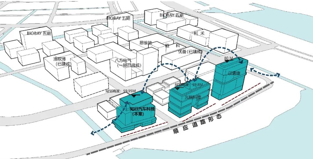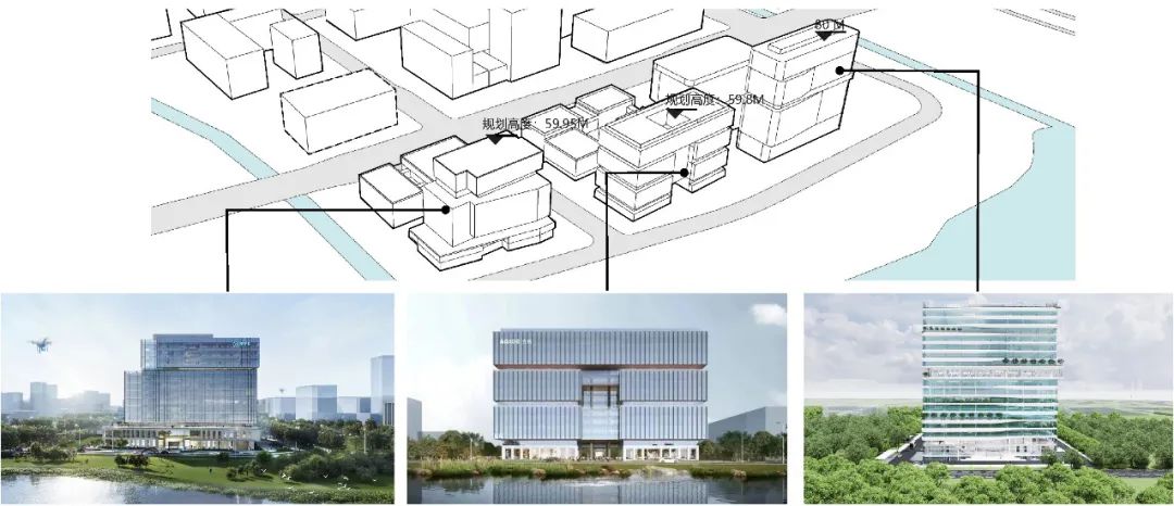 作为重要的沿江城市界面,项目力求通过一体化设计使整个片区内沿吴淞江界面过渡自然、语言一致与立面材料呼应。整体规划形态顺应地块及规划道路形态。建筑上自西向东、自南向北逐步升高,形成多个观景平台,不但完成了沿钱家田港向多个工业(研发)用地的城市形体过渡,还减少地块对钱家田港西侧未来地块的压迫感。高度与周边地块相一致,控制规划高度 60米,加强吴淞江第一排天际线的整体感。仓库和生产车间高度控制遵循与研发办公楼相同秩序,沿北侧城市道路自西向东升高,并与其他地块的生产用房界面守齐、高度统一,保证了城市道路层面的形体协调性。