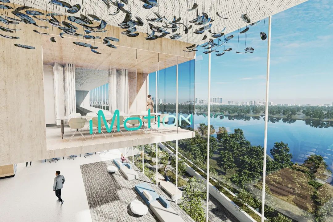 设计团队同时利用建筑形体形成的景观平台,进行室内外环境交互空间设计,在平台上,设置折叠玻璃门,让员工、访客可以置身于自然中。景观设计对多个平台进行分区、分段设计,结合室内空间功能和形式,使科研员工可以在自然中休憩、激发灵感,访问人员在美景中进行会晤。