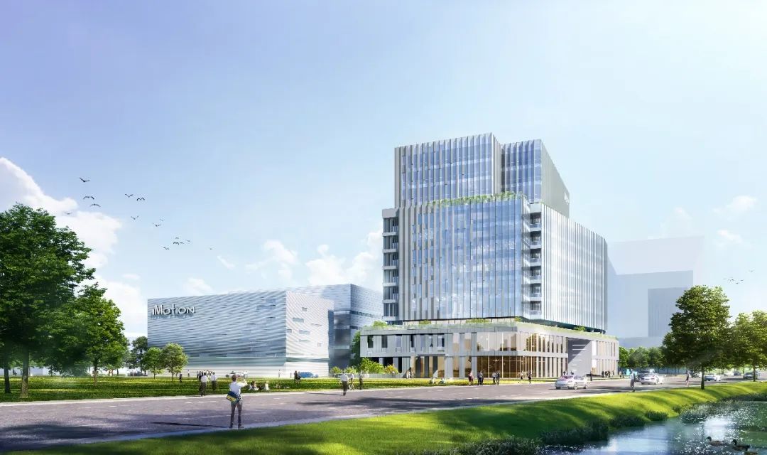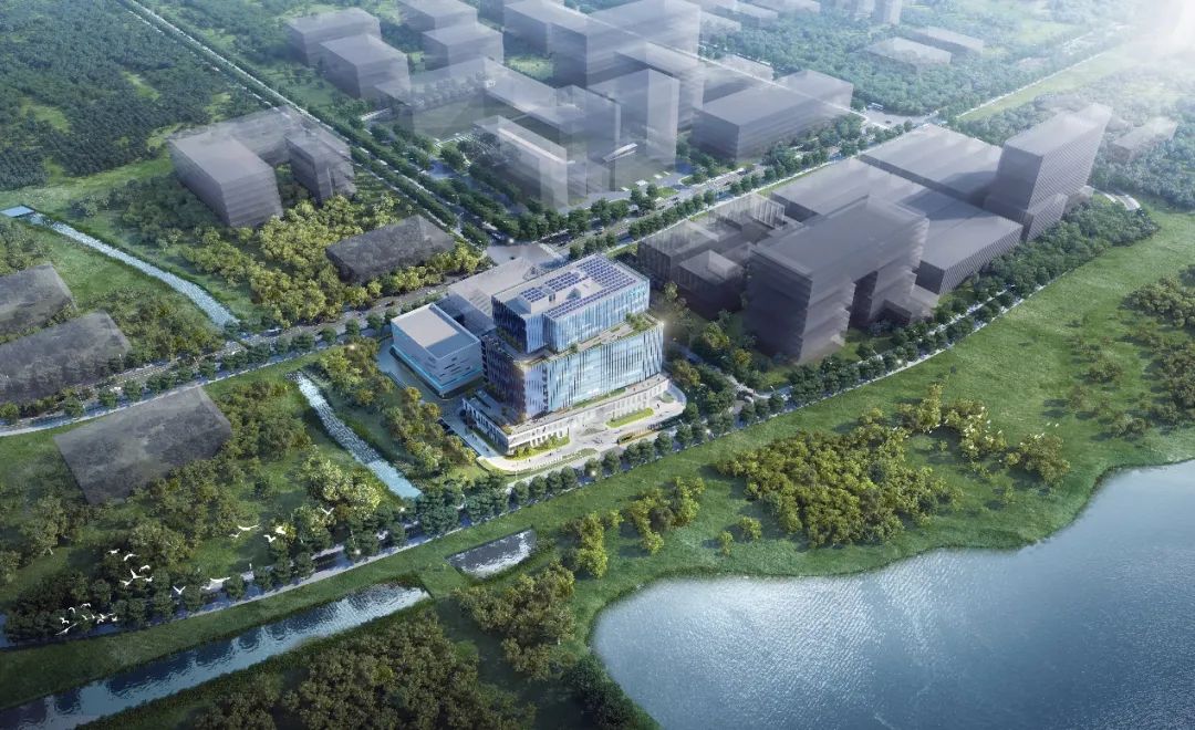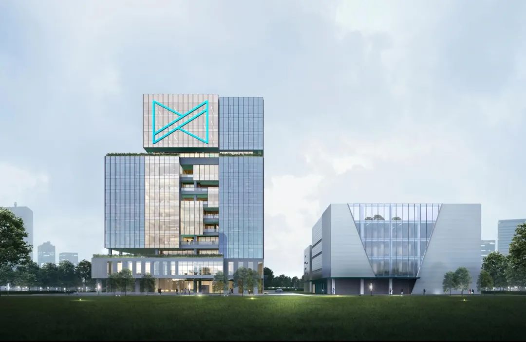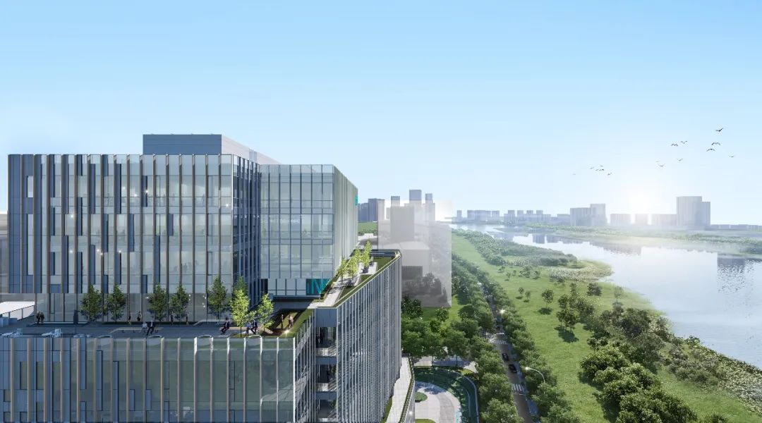 总部研发办公楼沿吴淞江建设,沿北侧道路依次设置仓库及生产车间。为了充分利用区域优越的景观优势,最大化城市界面,建筑形体顺应地块形态进行布局,并结合纵向功能分布,生成基础体块。设计团队经过对基地和周边地块沿吴淞江体量的深入考量,对形体进行退进处理,打造多个景观平台,生成的“山谷”意向,并将“智谷”、“绿谷”设计理念融入其中,使西侧城市水系到总部园区的整体天际线得以自然过渡,更使设计理念、城市体量及建筑功能高度统一、相得益彰。