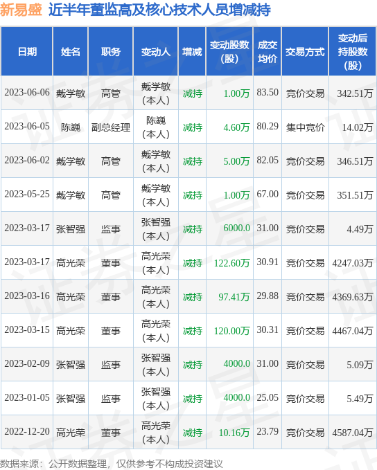 新易盛近半年内的董监高及核心技术人员增减持详情如下: