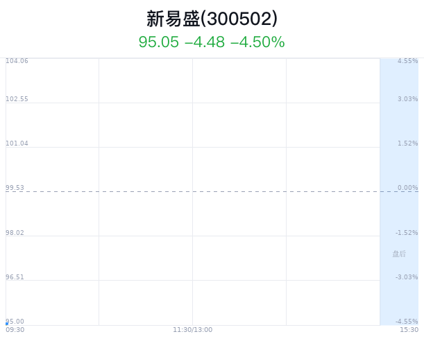 04月03日,新易盛(300502)股价大幅下跌,截至09点30分,新易盛下跌5.09%,报94.46元/股,成交3.82亿元,换手率0.64%,振幅1.54%。