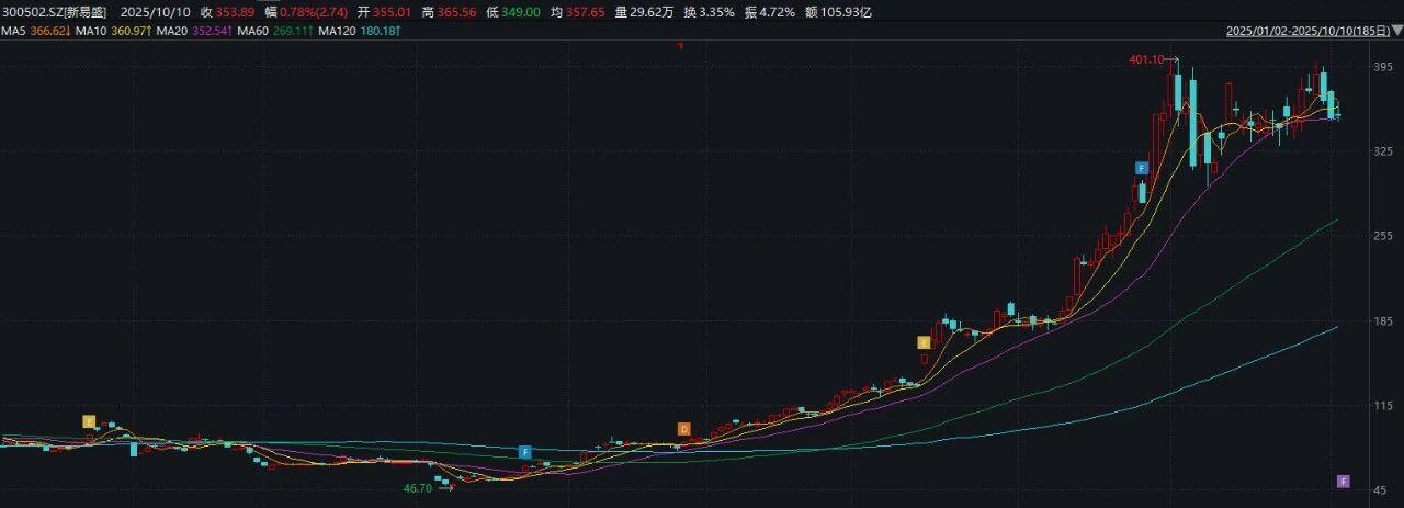 随着业绩的走高以及市场的走强,新易盛也成为了“大牛股”。截至10月10日午盘,新易盛年内股价涨超330%,总市值3518亿元。