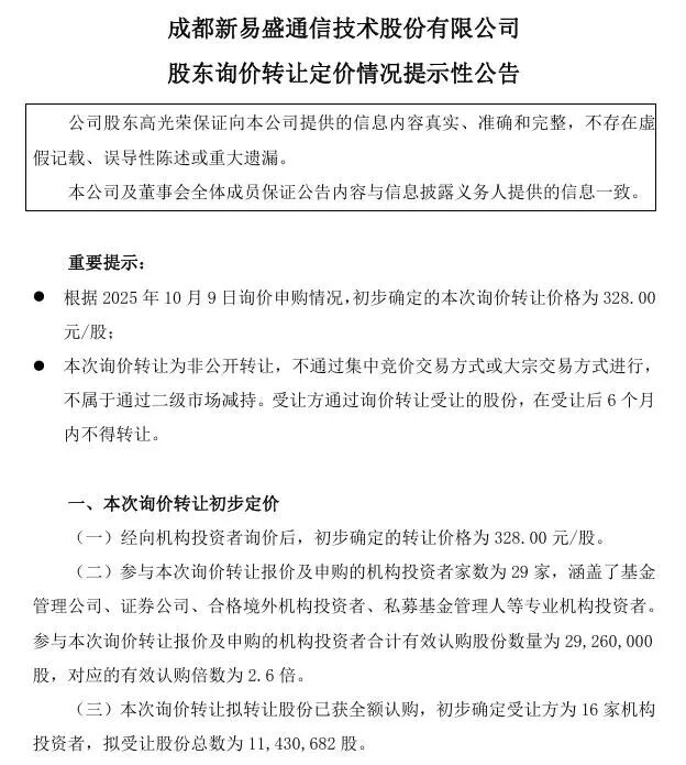 10月9日晚,新易盛公告,初步确定本次询价转让价格为328元/股,当日公司股价收报351.15元/股。