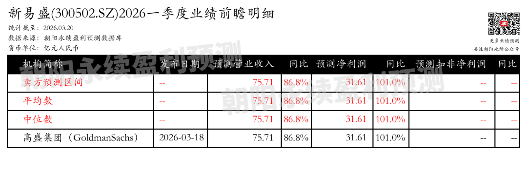 截至2026年03月20日,根据朝阳永续季度业绩前瞻数据: