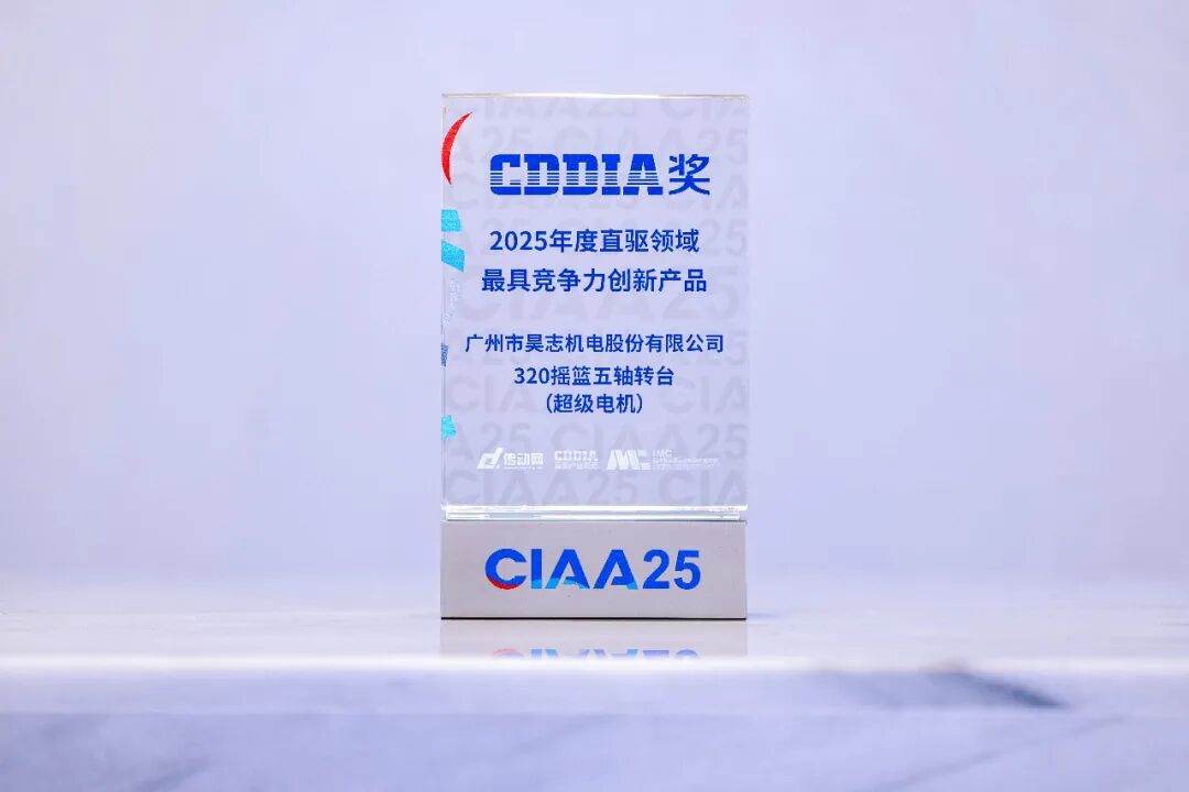 在刚刚落幕的“CIAA25-运动控制/直驱技术产业发展高峰论坛暨颁奖盛典”上, 昊志机电 320摇篮五轴转台(超级电机) 凭借卓越的性能与市场竞争力,荣获 “CDDIA2025年度直驱领域最具竞争力创新产品” 大奖。这份荣誉,是行业对 昊志机电 持续引领直驱技术发展、破解高端制造瓶颈的权威认可。