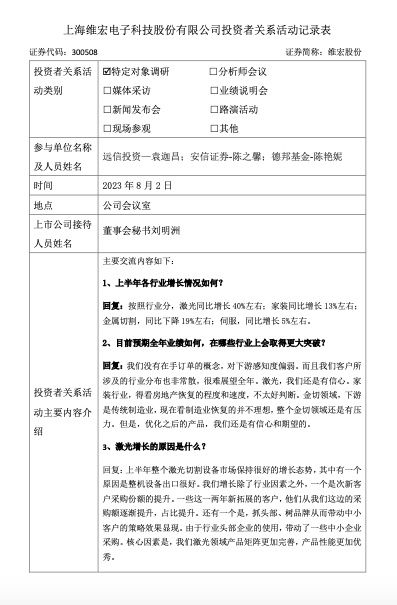 上海维宏电子科技股份有限公司(以下简称“维宏股份”或“公司”)8月4日发布公告称,公司于8月2日接受了远信投资、安信证券、德邦基金的特定对象调研。在调研中,维宏股份透露,上个月的青岛机床展,公司FE系列首款产品亮相,该产品是3-5轴联动。公司有比较丰富的五轴功能集,RTCP只是其中一项。公司在实木雕刻、水切割运用得很丰富。在金切领域知名度还比较低。由于在木工、水切割的经验积累,公司就移植到激光切割领域,预计10、11月左右,公司会推出激光三维五轴。