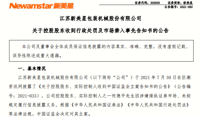12月5日,新美星发布公告称,公司接到何德平先生函告,获悉何德平于2021年12月2日收到了证监会出具的《行政处罚及市场禁入事先告知书》。证监会就操纵证券市场行为,对何德平及其他四位当事人没收违法所得4783.56元,并处以1.44元罚款,共计罚没1.918元;就信息披露违法行为,对何德平给予警告,并处以40万元罚款;并且,证监会还拟决定对何德平采取10年市场禁入措施。