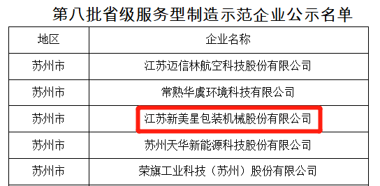 近日,省工信厅公示了第八批江苏省服务型制造示范企业(平台)名单。新美星经过一系列推荐、评选、考核等程序,成功获评,光荣上榜。
