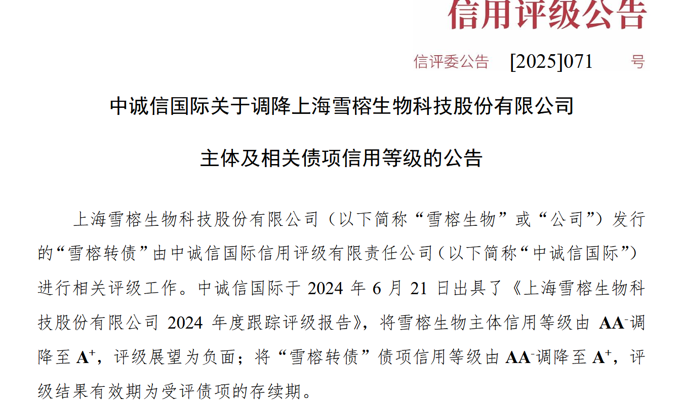 近日,上海雪榕生物科技股份有限公司(以下简称“雪榕生物”)交出预亏业绩后,信用评级再次遭下调。评级机构中诚信国际决定将雪榕生物的主体信用等级由“A+”调降至“A”,并将“雪榕转债”债项信用等级同样由“A+”调降至“A”。这是自2024年6月以来,雪榕生物信用评级第二次遭下调,市场对其未来发展前景表示担忧。