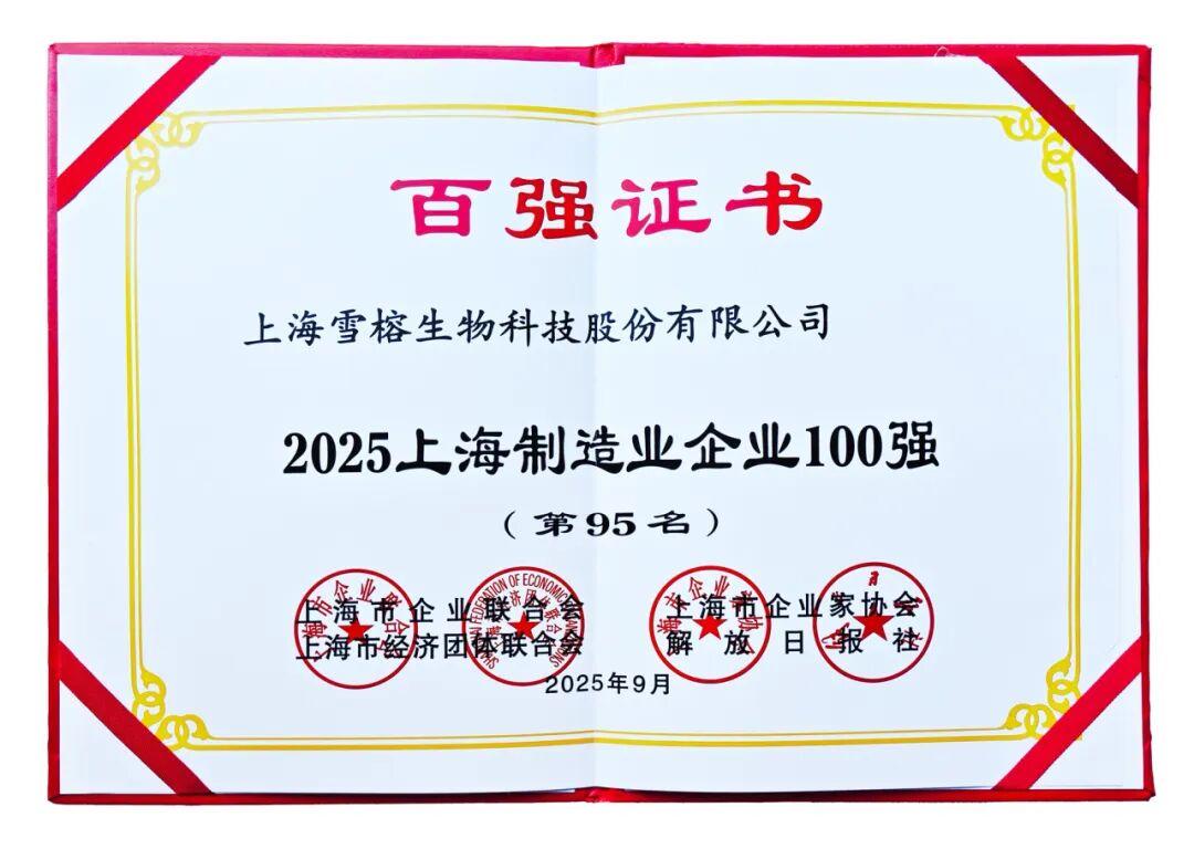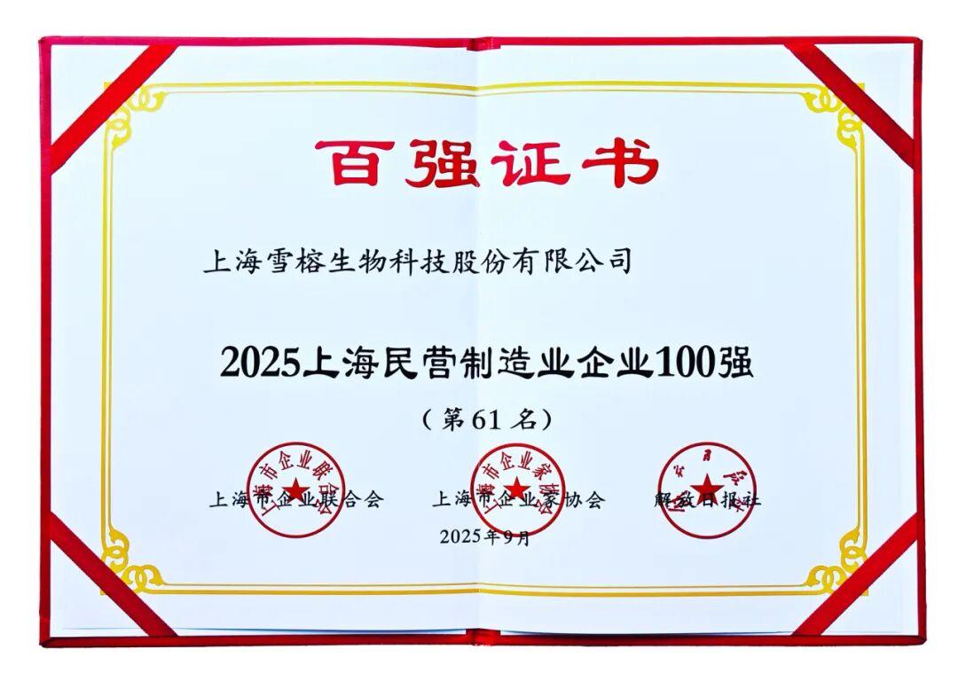 为农业产业化国家重点龙头企业,雪榕生物凭借长期稳健的经营表现和健康的发展韧劲,再次荣膺“2025上海制造业企业100强(第95位)”、“2025上海民营制造业企业100强(第61位)”双重荣誉。上海雪榕生物科技股份有限公司光荣上榜!