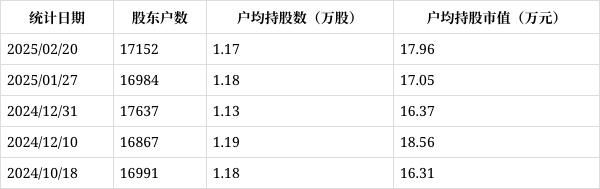 从2月28日公开信息显示,友讯达截至2025年2月20日公司股东户数为1.72万户,较上期(2025年1月27日)增加168户,增幅为0.99%,变化不大。