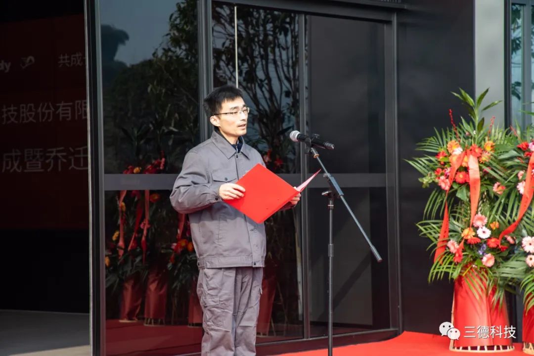 制造二部的陈勇作为员工代表发言。今年是他加入三德大家庭的第十年,一路见证制造二部从宁乡租用车间、成城工业园、到公司总部生产车间的搬迁变化,自动化产品开发交付的十年历程。他表示长兴园区一流的生产环境,使得大家对自动化产品的交付充满了信心!在以后的工作中,大家将以崭新的姿态和更高的要求,扎实工作,开拓创新,持续改善,在装配过程中严把质量关,交付出稳定、可靠的产品!