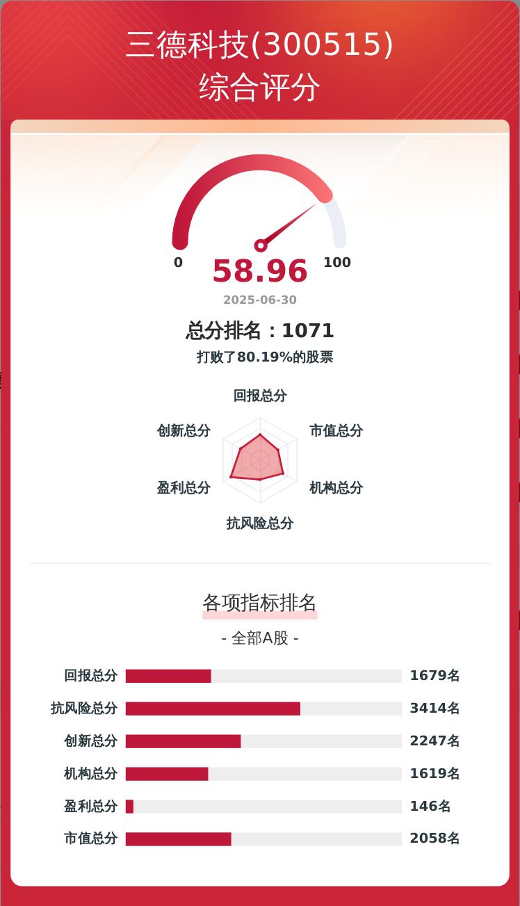 金融界上市公司研究院构建了一套上市公司韧性评价体系,从企业盈利、科技创新、股东回报、经营抗风险、市值表现及机构吸引力六个维度对企业进行量化评分,满分为100分。三德科技的韧性评价总分为58.96分,在A股5405家可比上市公司中排名第1071位。