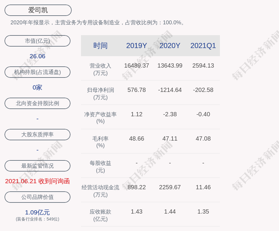 2020年年报显示,爱司凯的主营业务为专用设备制造业,占营收比例为:100.0%。
