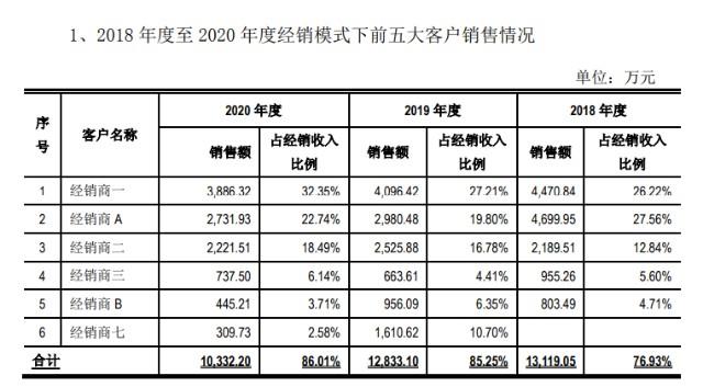 从2020年年报问询函公司披露的前五大客户销售情况看,前三大经销商销售占比达70%的格局始终没有改变。