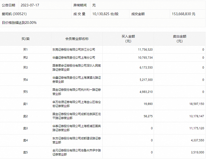7月17日,爱司凯今日涨停,龙虎榜数据显示,上榜营业部席位全天成交8978.14万元,占当日总成交金额比例为58.42%。其中,买入金额为3897.45万元,卖出金额为5080.7万元,合计净卖出1183.25万元。