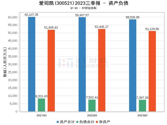 在资产负债方面,爱司凯2023年三季度的总资产为5.85亿元,较上年度末的5.9亿元略有下降。负债总额为7397.39万元,较上年度末的7601.7万元有所减少。净资产为5.11亿元,较上年度末的5.13亿元略有下降。资产负债率为12.64%,较上年度末的12.9%有所下降。