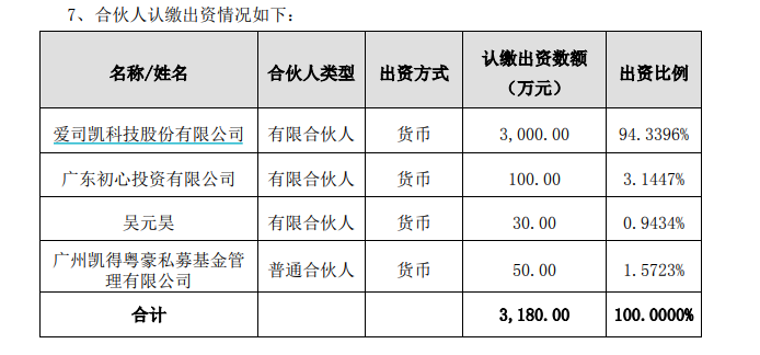 公告显示,该基金由爱司凯与广州凯得粤豪私募基金管理有限公司、广东初心投资有限公司、吴元昊近日共同投资设立,其中,爱司凯认缴出资额3000万元,占认缴出资总额的94.3396%,广东初心投资有限公司认缴出资额100万元,占认缴出资总额的3.1447%。