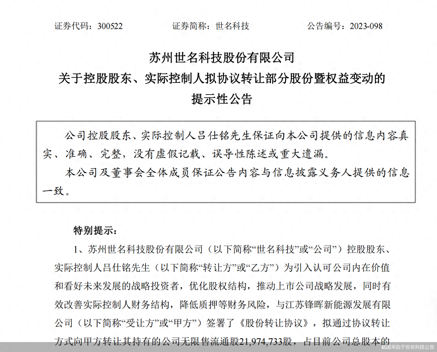 据世名科技最新公告,公司实控人吕仕铭拟协议转让2197.47万股公司股份。