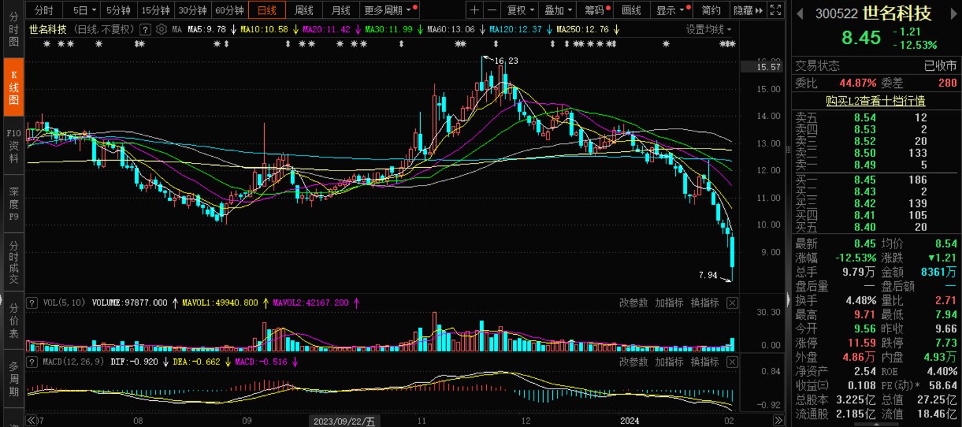 显然,对世名科技而言是利好。但二级市场表现,却未能刺激股价。相反地,1月30日至2月5日,世名科技连续阴跌,2月5日盘中创下7.94元的新低。