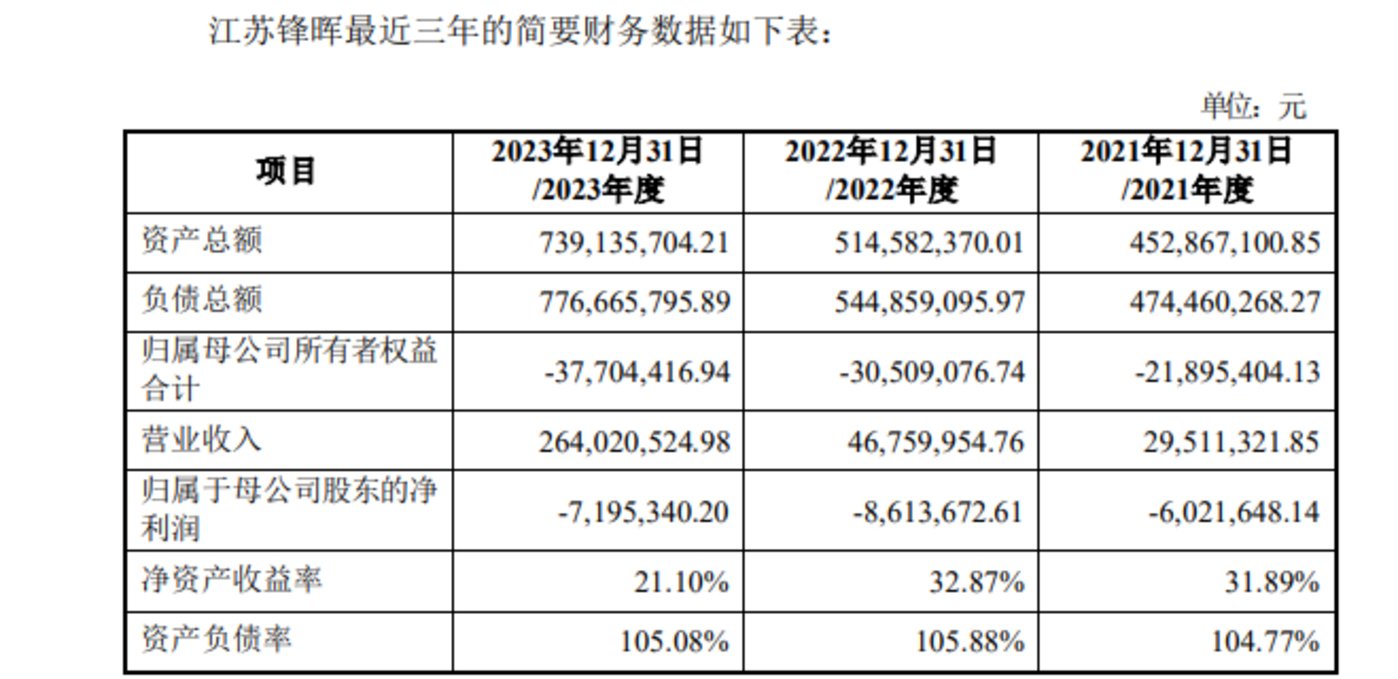 不仅如此,江苏锋晖的经营业绩难言乐观。2021-2023年,江苏锋晖实现营业收入分别约2951.13万元、4676万元、2.64亿元,对应的归属净利润分别亏损602.16万元、861.37万元、719.53万元。