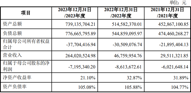 世名科技的公告显示,2021年至2023年,江苏锋晖的净资产分别合计为-2189.54万元、-3050.91万元、-3770.44万元,资产负债率分别为104.77%、105.88%、105.08%。