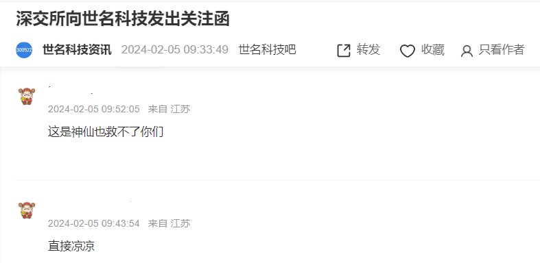 “这是神仙也救不了你们”、“直接凉凉”,投资者在世名科技股吧里议论纷纷。