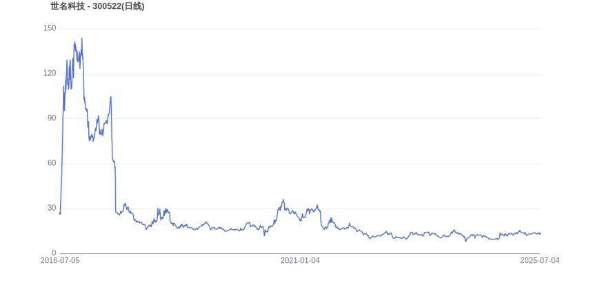 从上市首日至今,世名科技的市值实现了1.40倍的增长。2016年10月14日,世名科技的市值巅峰达到98.89亿元,股价也顺应升至148.33元。而至7月4日收盘,世名科技的股价为13.23元,市值为42.66亿元,相比峰值时期市值减少56.23亿元,市值蒸发了56.86%。