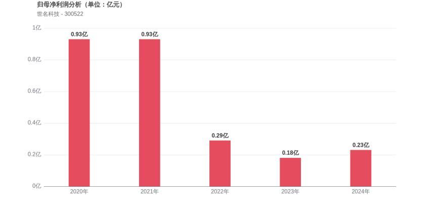 利润角度分析,2020年世名科技实现归母净利润0.93亿元,2024年0.23亿元。利润水平大幅下降,盈利能力明显承压。