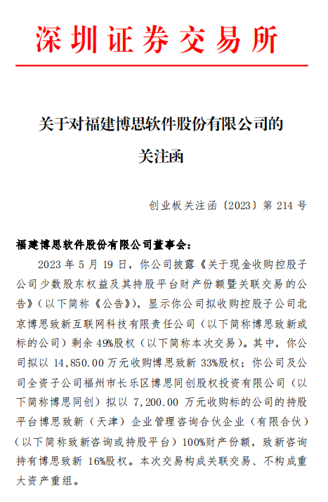 终止收购北京博思致新互联网科技有限责任公司(下称“博思致新”)49%股权近两年后,博思软件近期重启了这笔交易,但也因此收到了深交所的关注函。深交所要求博思软件就交易方案变更、是否规避资产重组、交易价格是否公允、业绩对赌等多个问题作出说明。