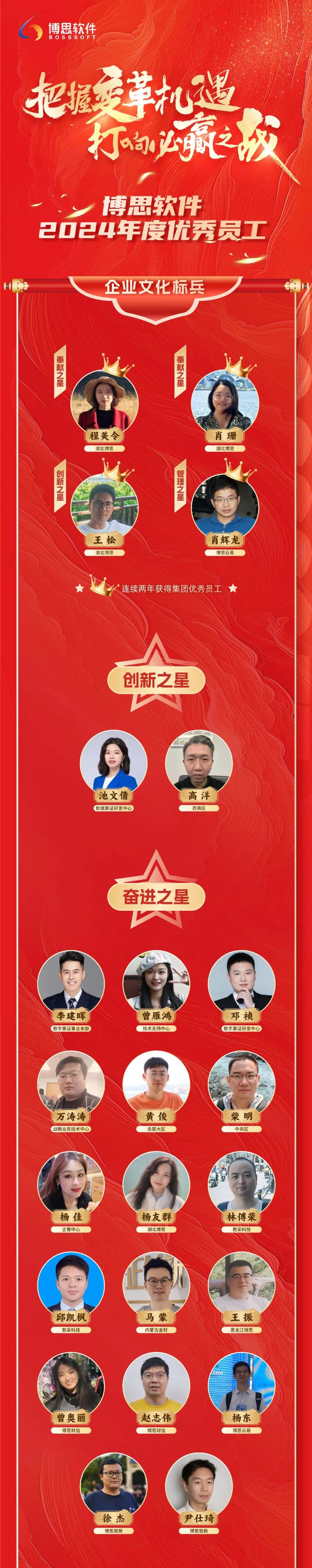 回望2024,全体博思同仁心往一处想,劲往一处使,以不懈创新为驱动,为客户提供卓越的产品与服务,共筑社会价值新高地。在奋勇拼搏的路上,涌现出了一批杰出的典范。他们以实际行动诠释了前行的决心与勇气,成为了我们学习的榜样和力量。