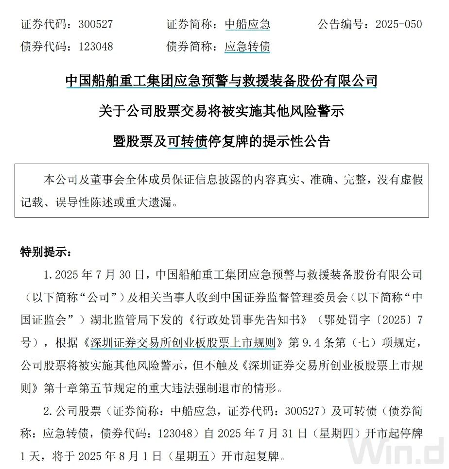 中船应急称,公司股票及可转债自2025年7月31日(星期四)开市起停牌1天,将于2025年8月1日(星期五)开市起复牌。公司股票自2025年8月1日(星期五)被实施其他风险警示,股票简称由“中船应急”变更为“ST应急”;股票代码不变,仍为“300527”;实施其他风险警示后,股票交易的日涨跌幅限制不变,仍为20%。