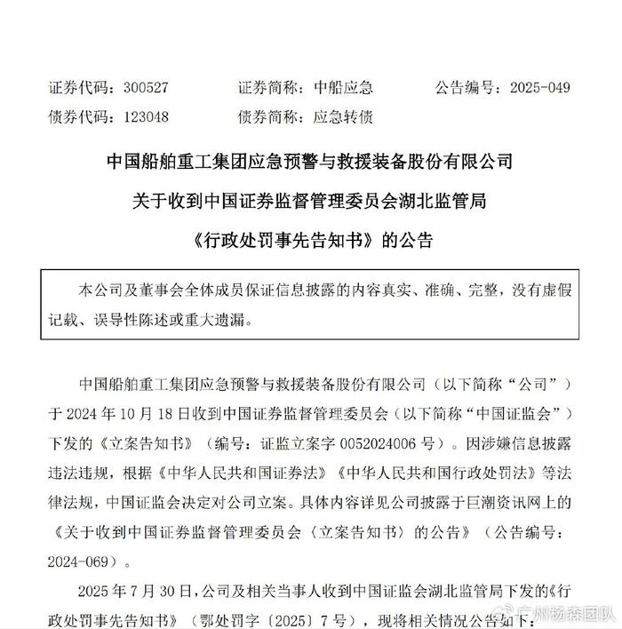 2025年7月31日,中国船舶重工集团应急预警与救援装备股份有限公司(公司或中船应急)披露,公司及相关当事人收到中国证监会湖北监管局下发的《行政处罚事先告知书》。
