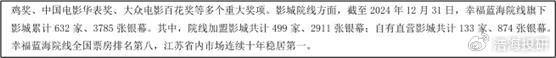 其次,作为院线方,幸福蓝海的大本营在南京,而南京只是票房的一部分。此外,根据幸福蓝海2024年年报披露,公司2/3以上的影院为加盟影城。换句话说,放映分账大头还是加盟影院的,幸福蓝海只收个加盟费。