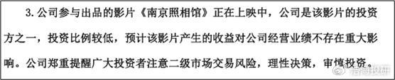 首先,虽为影片的投资方之一,根据公司公告,公司投资比例较低,预计对公司经营业绩影响有限。