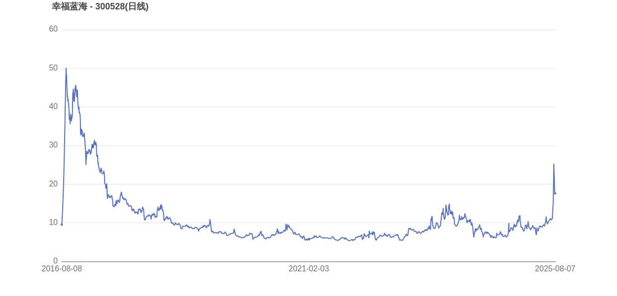幸福蓝海自2016年8月8日上市至今,已迎来9周年。从上市首日收盘价为9.53元、市值29.59亿元,到如今市值达到65.58亿元。