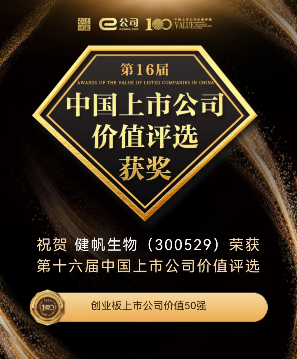 近日,健帆生物在第十六届中国上市公司价值评选中荣获“创业板上市公司价值50强”。
