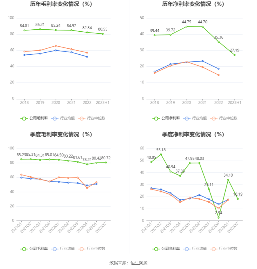 2023年上半年,公司毛利率为80.55%,同比下降3.24个百分点;净利率为27.19%,较上年同期下降20.81个百分点。从单季度指标来看,2023年第二季度公司毛利率为80.72%,同比下降2.50个百分点,环比上升0.30个百分点;净利率为18.19%,较上年同期下降29.84个百分点,较上一季度下降15.91个百分点。