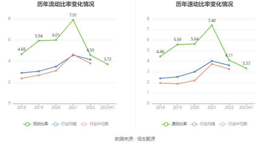 2023年上半年,公司流动比率为3.72,速动比率为3.33。