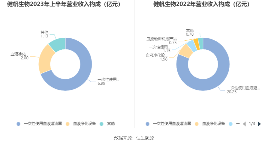 分产品来看,2023年上半年公司主营业务中,一次性使用血液灌流器收入6.99亿元,同比下降47.65%,占营业收入的69.11%;血液净化设备收入2.00亿元,占营业收入的19.71%。