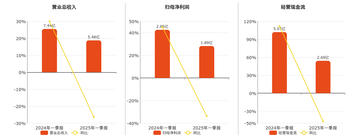 公司营业总收入为5.48亿元,较去年同报告期营业总收入减少1.97亿元,同比较去年同期下降26.40%。归母净利润为1.89亿元,较去年同报告期归母净利润减少9598.25万元,同比较去年同期下降33.71%。经营活动现金净流入为2.69亿元,较去年同报告期经营活动现金净流入减少2.38亿元,同比较去年同期下降46.94%。