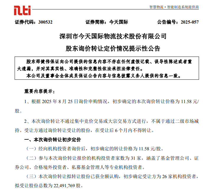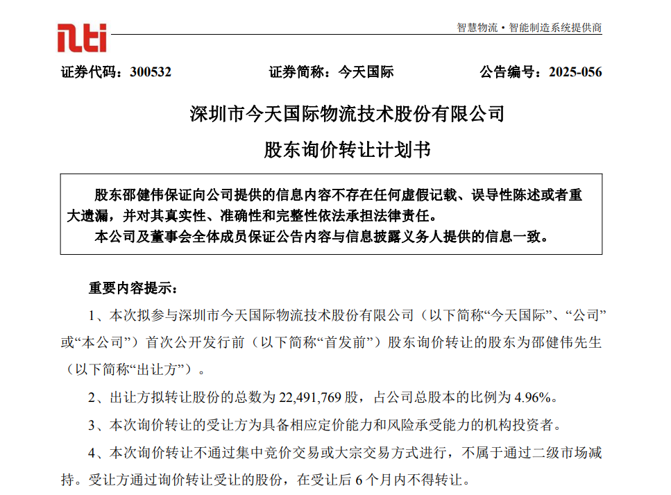 8月22日晚间,今天国际公告,公司控股股东、实际控制人邵健伟拟询价转让公司股份2249.18万股,占公司总股本的比例为4.96%。