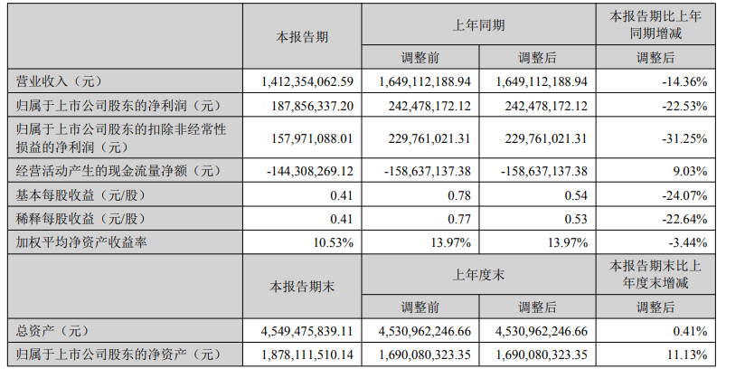 毛利率24.61%,同比减14.73%,净利率13.3%,同比减9.54%,销售费用、管理费用、财务费用总计8970.17万元,三费占营收比6.35%,同比增0.76%,每股净资产4.14元,同比减28.41%,每股经营性现金流-0.32元,同比增37.75%,每股收益0.41元,同比减24.07%