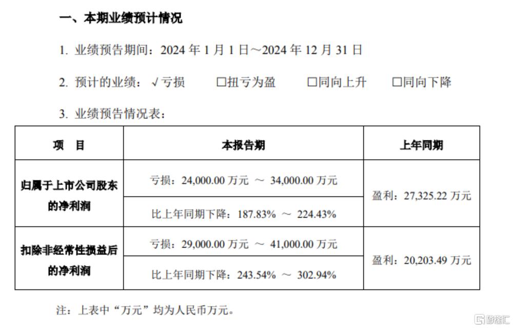 扣非净利润为2.9亿元-4.1亿元,同比下降243.54%-302.94%,去年同期为盈利2.02亿元。