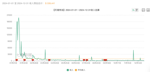 从收入端来看,七麦数据显示,《天境传说》的收入自1月16日之后便出现暴跌,2024年全年的收入预估仅为33.94万美元。